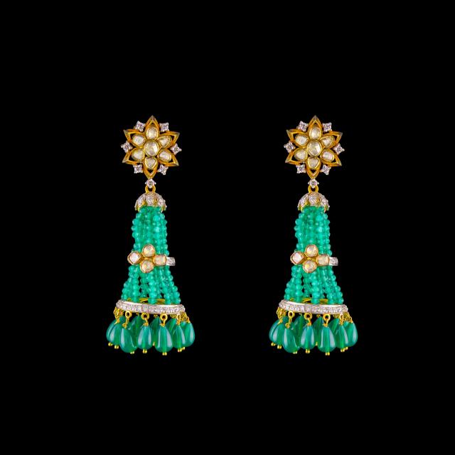 18K Gold Polki Earrings with Emerald Bead Tassels & Diamond Accents