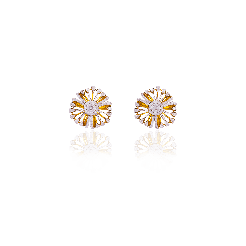 Crafted in 18K Yellow Gold, these modern, minimalist earrings feature a rounded trillion shape, with four marquise-cut diamonds surrounding a central round brilliant-cut diamond. Designed to make a statement, they exude gracefulness, perfect for both everyday and occasional wear.