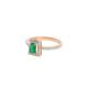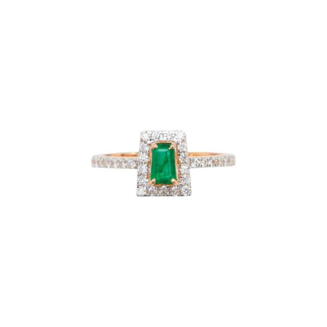 Embrace timeless elegance with the Verdant Glow Ring, a masterpiece crafted in 18K rose gold. This exquisite piece features a stunning tapered green emerald at its heart, radiating lush vibrance. Encircling the emerald, a brilliant arrangement of white diamonds adds a dazzling touch, creating a harmonious balance between color and sparkle. Perfect for those who treasure sophistication and nature-inspired beauty.