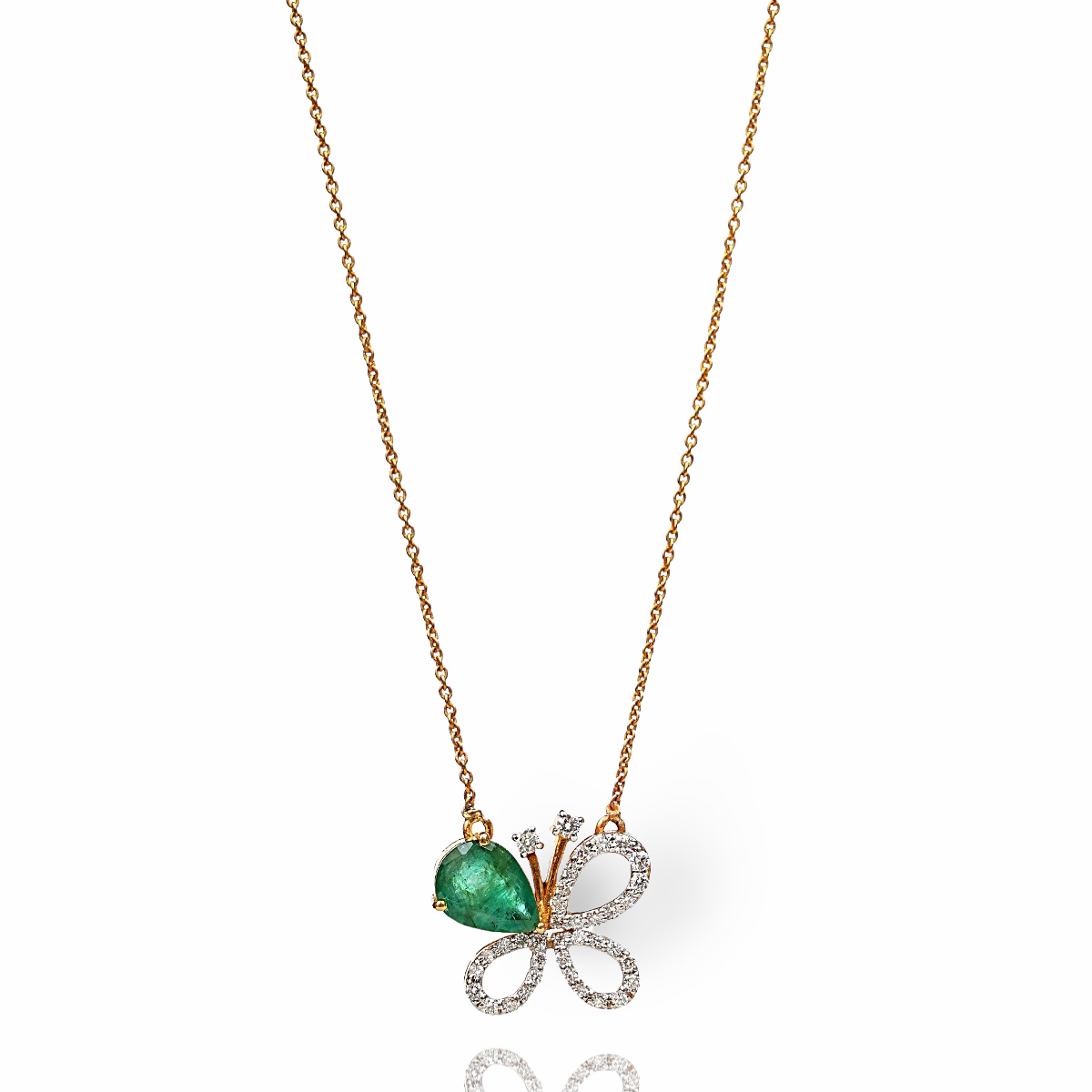 Embrace everyday elegance with "GoldenFlutter," a mesmerizing 18K Yellow Gold Pendant-Earrings Set. Modern and minimalist, these exquisite pieces showcase round brilliant cut natural diamonds of VVS clarity and EF color. Inspired by butterflies, the pear-shaped natural emerald cut stones mirror the delicate grace of wings. Meticulously crafted, GoldenFlutter is a captivating blend of sophistication and nature-inspired beauty, making it the perfect accessory for daily wear.