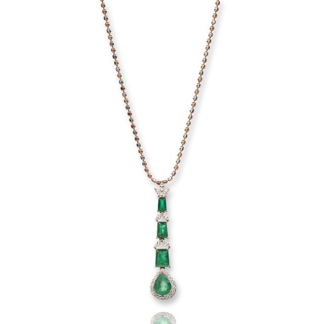 Experience the allure of "Emerald Cascade," a masterpiece by V.M. Ornaments designed for everyday elegance. Crafted in 18K Yellow Gold, this Diamond and Gemstone Jewelry set combines the brilliance of natural round brilliant cut and marquise cut diamonds with VVS clarity and EF color. The pendant boasts a vertical graduation of tapered natural emeralds, leading to a stunning pear-shaped centerpiece. Meticulously crafted, this set is a captivating blend of allure and sophistication, perfect for daily wear.