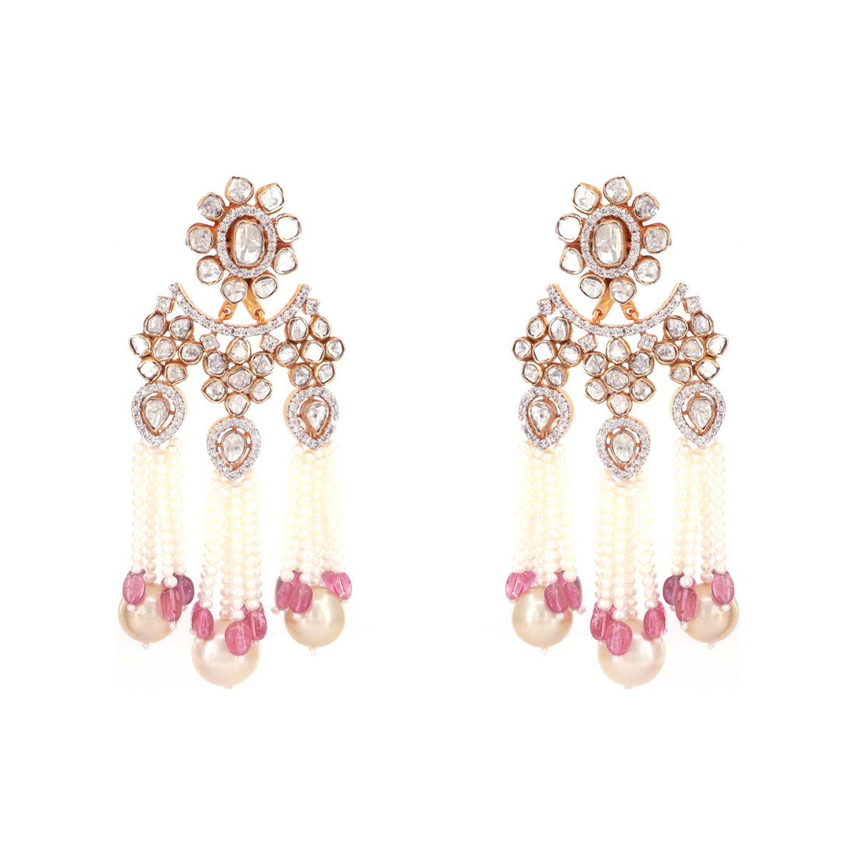 18K detachable earings studded with uncut polki diamond and round brilliant diamond.